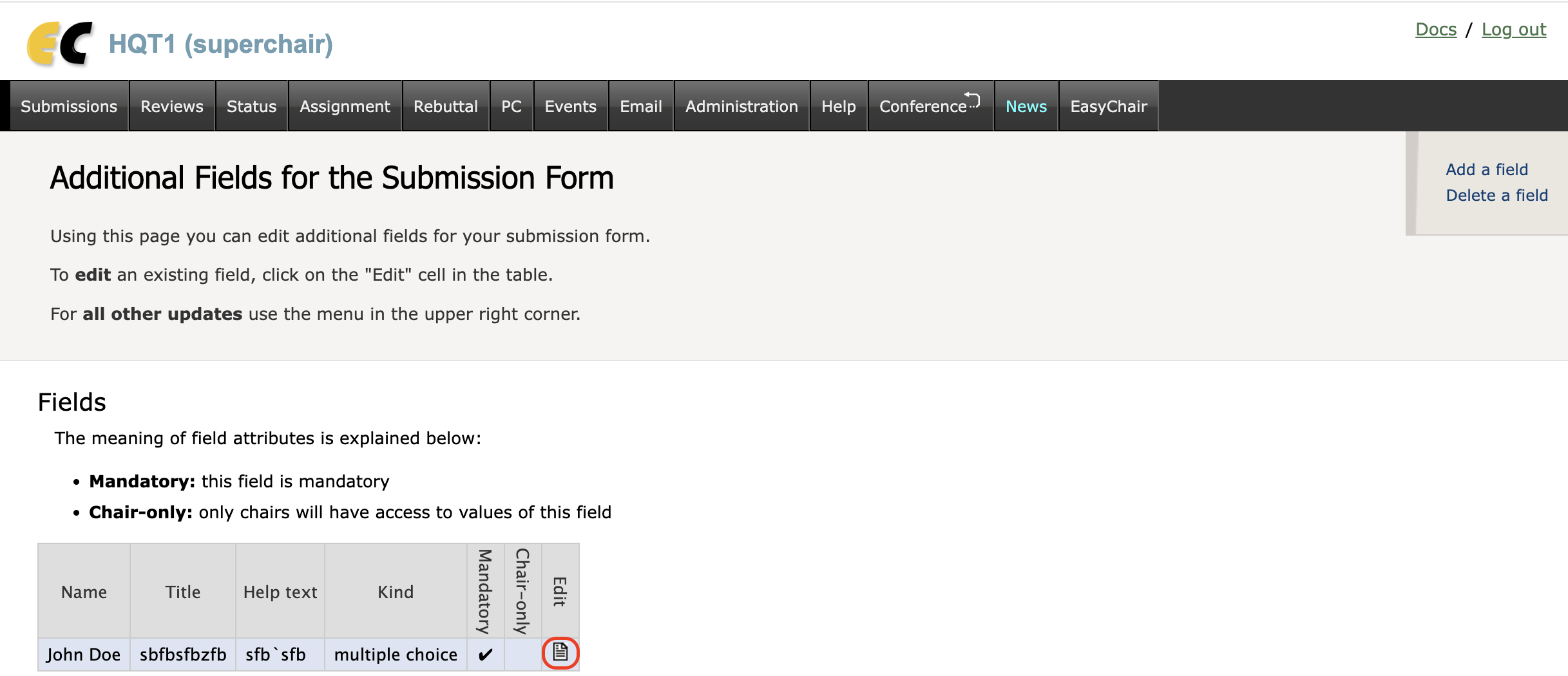 The EasyChair platform has a range of options to create and edit additional fields per the requirements of their conference. Chairs are able to add multiple choice fields, checkboxes, text fields and paragraph text fields.