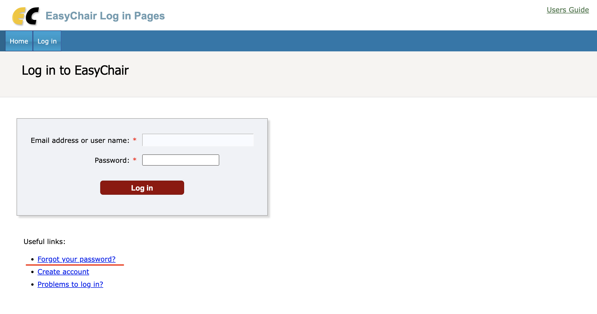 You should first access the forgotten user name or password page and fill out the form giving either your user name or the email address on your EasyChair account. It is common for EasyChair users to have several email addresses, so you should be careful that you use an email address associated with your EasyChair account.